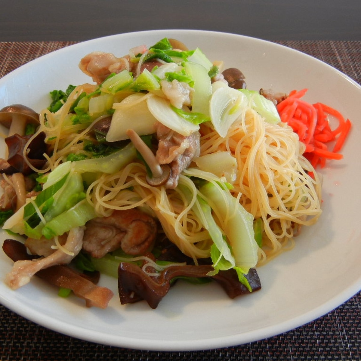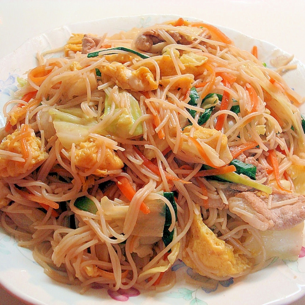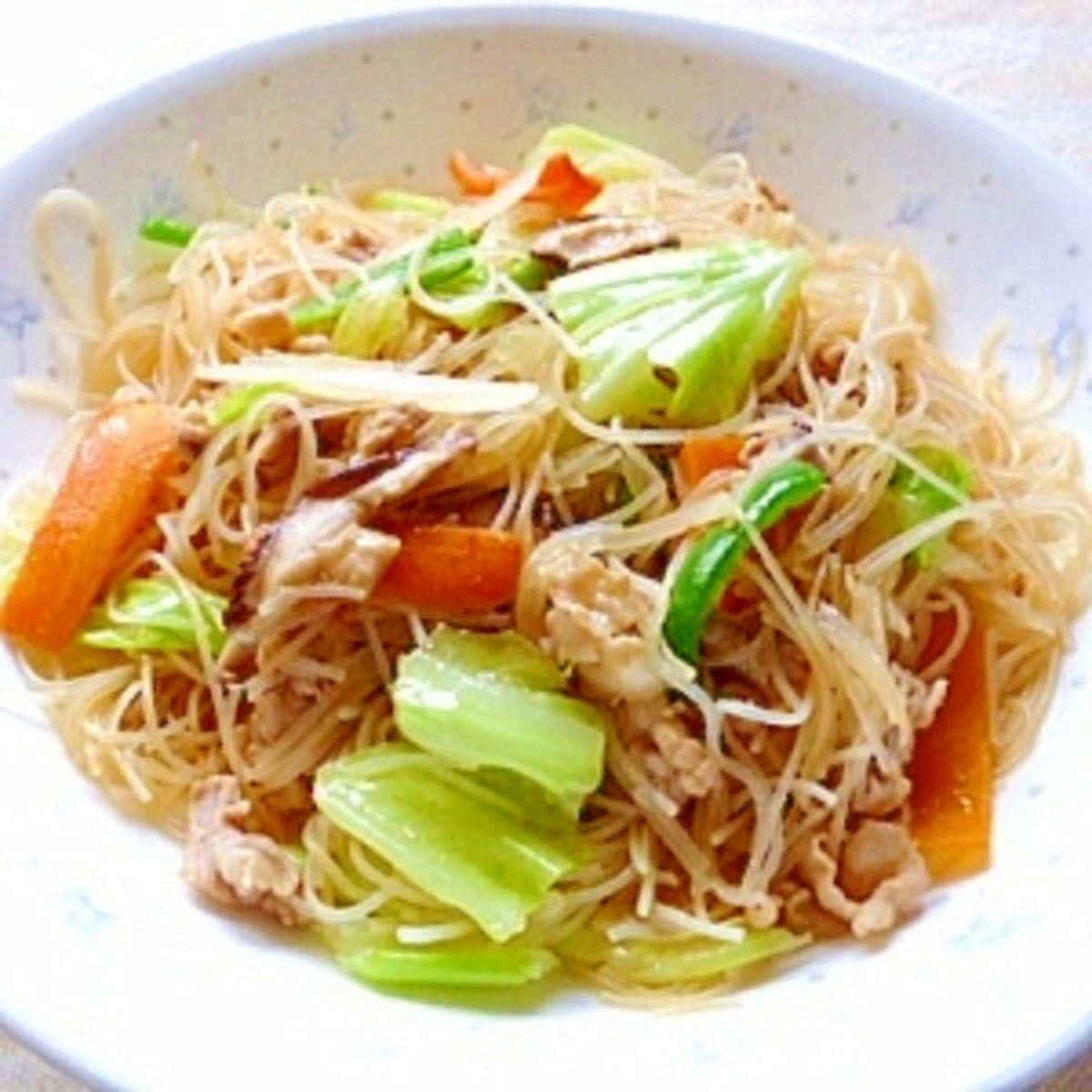 焼きビーフンのレシピ・作り方 作り方 1 中華鍋にサラダ油大さじ1を熱し、キャベツ、玉ネギ、ニンジン、シメジを強火で炒める。 2 全体にしんなりしたら、ニラを加えて炒め合わせ、塩コショウをしていったん取り出す。 3. 材料 乾燥ビーフン 100g 豚こま切れ肉 150g にんじん 1/3本(50g) 青梗菜 1株(100g) 中華風顆粒チキンスープの素 小さじ1 塩 小さじ1/2 水 カップ1/2 ごま油 大さじ1/2 作り方 準備 にんじん 幅1cm・長さ5cmの短冊形 青梗菜 軸の部分・・・八つ割りに、 葉の部分・・・5cm長さに切る. 失敗したことのある私が言うのもなんですが、ビーフンは簡単です。 いや簡単に作ったビーフンが美味しいものになる。のかもしれません。 祖母のビーフンの作り方 材料(この写真は4人分) ・ビーフン ・干し海老(水に戻しておく)、または桜海老.