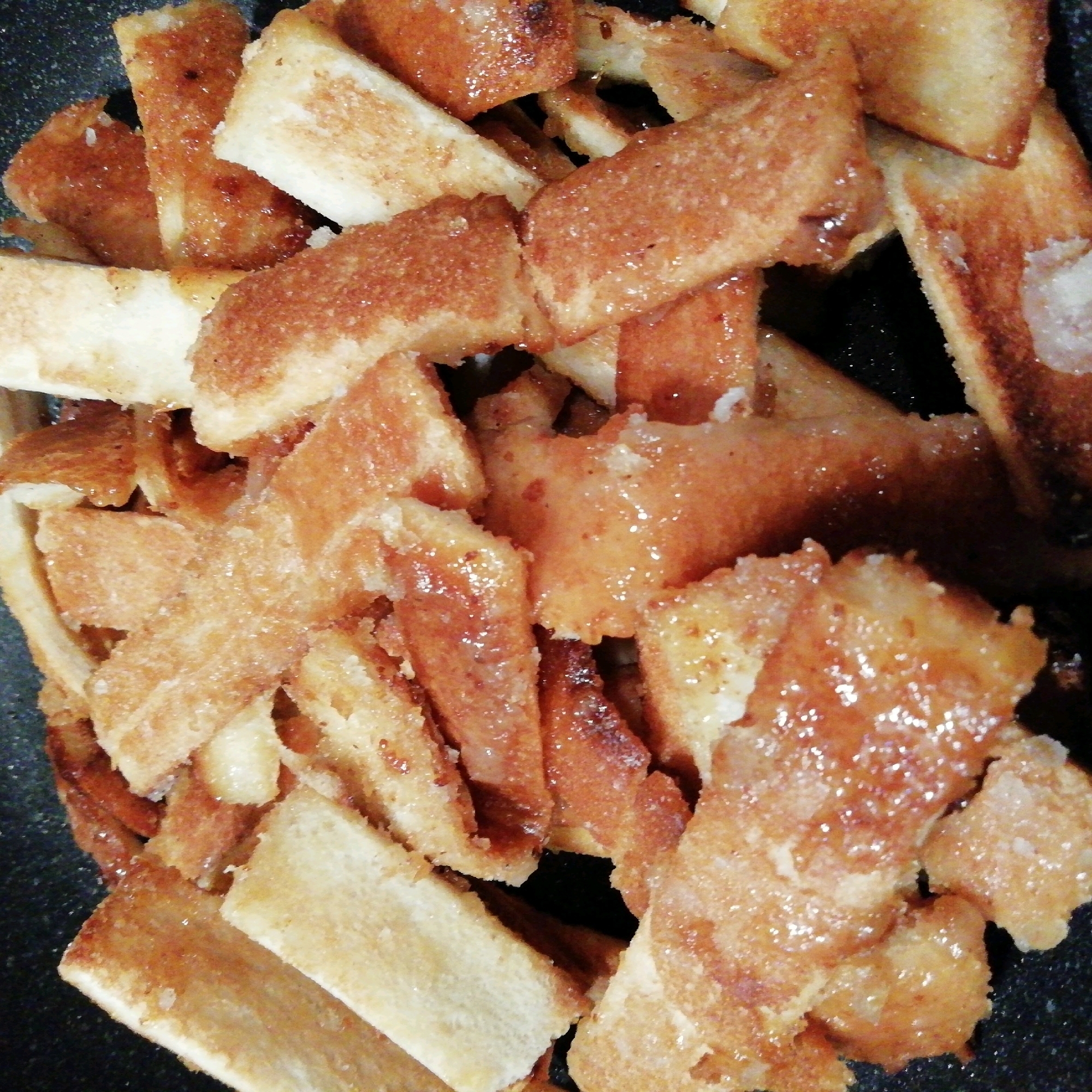 はらぺこグリズリー レシピ本大賞受賞 オーブントースター使うの面倒な人 めちゃくちゃ簡単 是非試して 焼きラスク フライパンにパンの耳入れてこんがり焼いてお砂糖大さじ1まぶして完成
